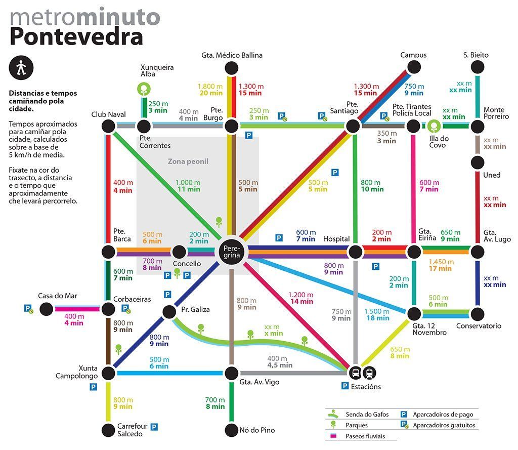 In Pontevedra, following the idea of promoting the car-free life style, the service radius of different facilities presents with the most suitable walking distance-400 meters (Newman et al., 2003).